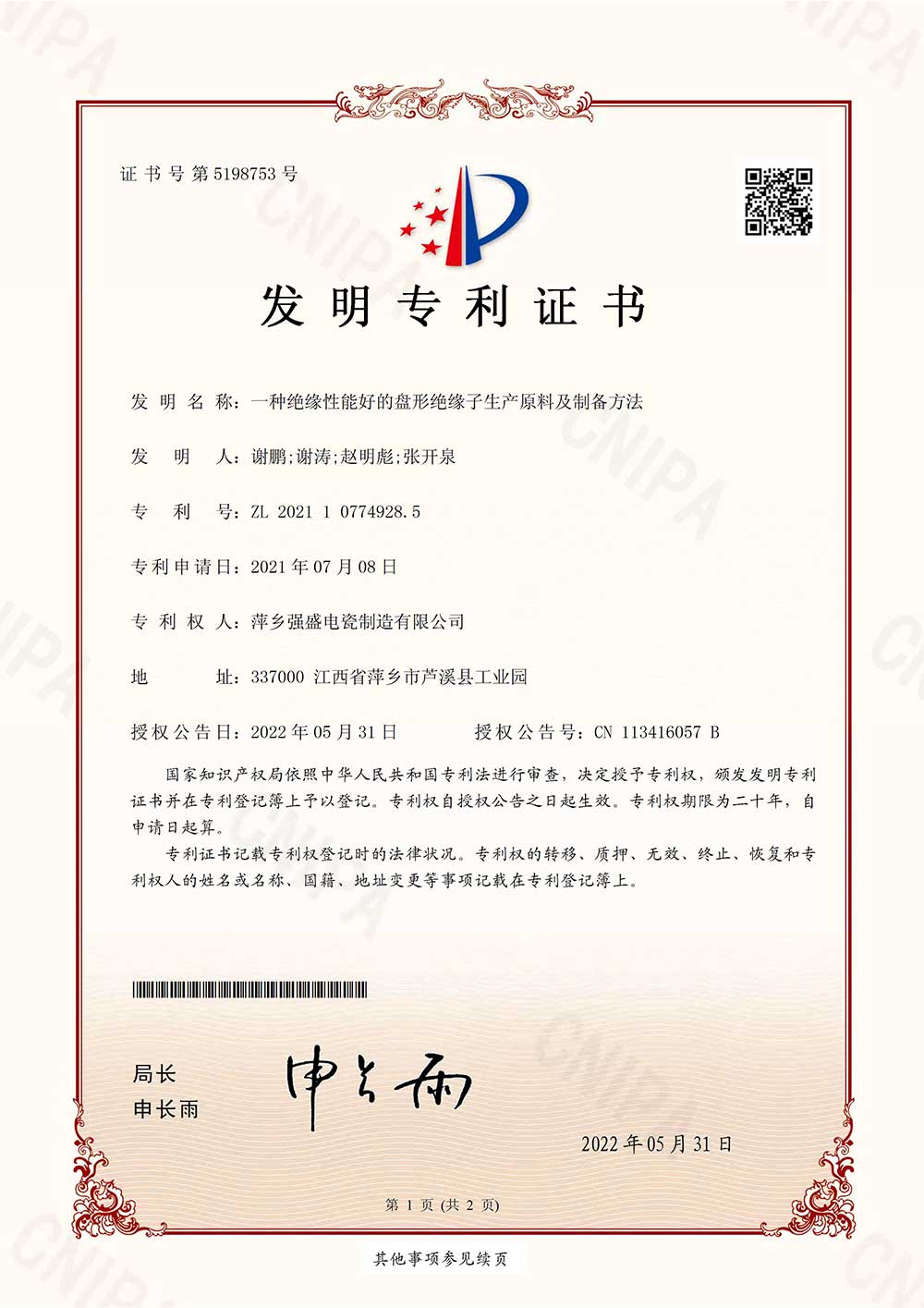 萍鄉(xiāng)強(qiáng)盛電瓷制造有限公司坐落于美麗的江西省萍鄉(xiāng)市蘆溪縣,成立于2009年,是一家集瓷絕緣子研發(fā)、設(shè)計、生產(chǎn)、銷售、服務(wù)一體的現(xiàn)代化生產(chǎn)企業(yè)。公司成立至今,一直專注于電力電網(wǎng)建設(shè)與發(fā)展,到目前為止公司獲得各種發(fā)明專利29余項。